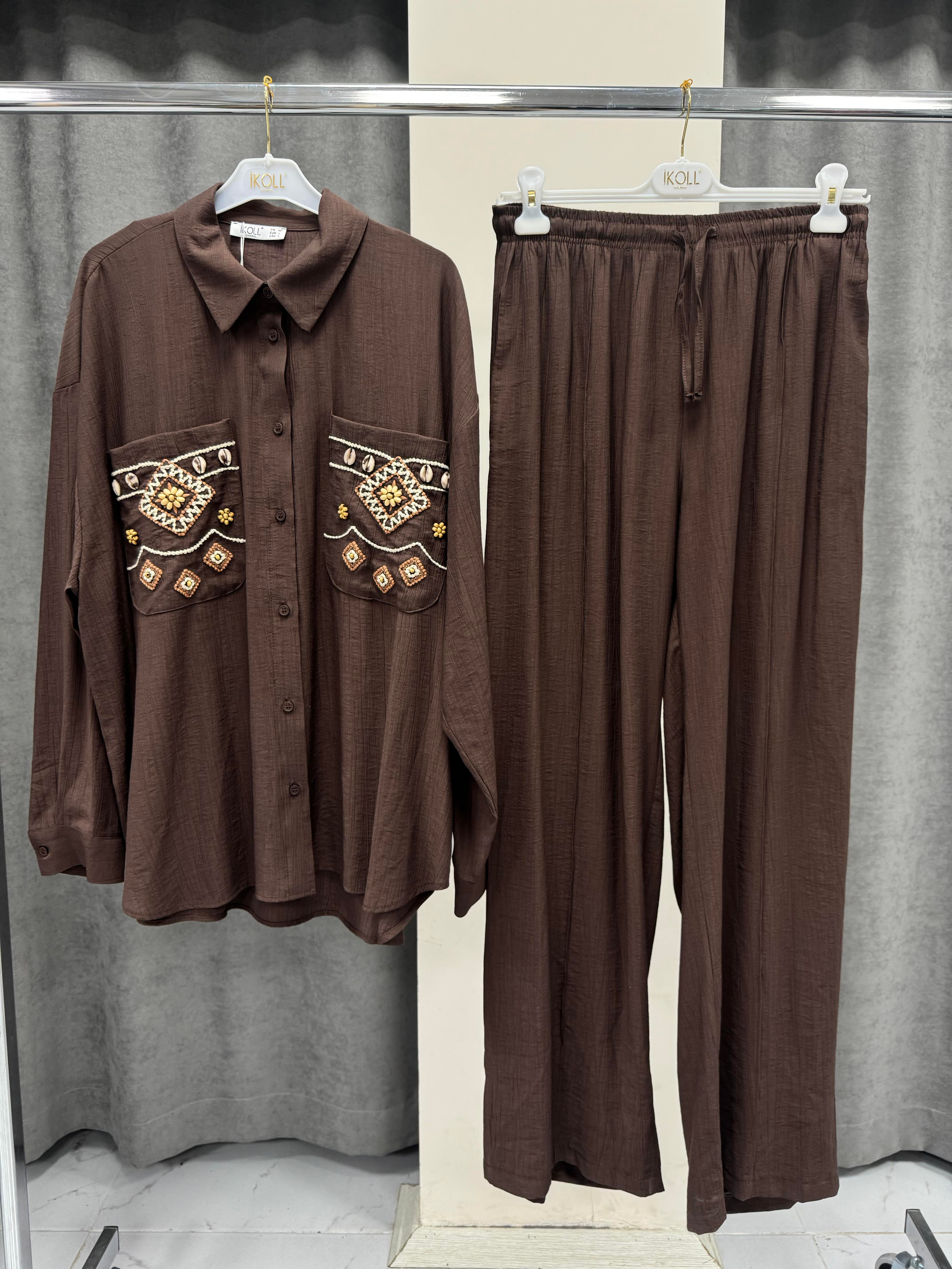16350 İKOLL CEP NAKIŞ VE İŞLEMELİ TAKIM - KOYU KAHVERENGİ