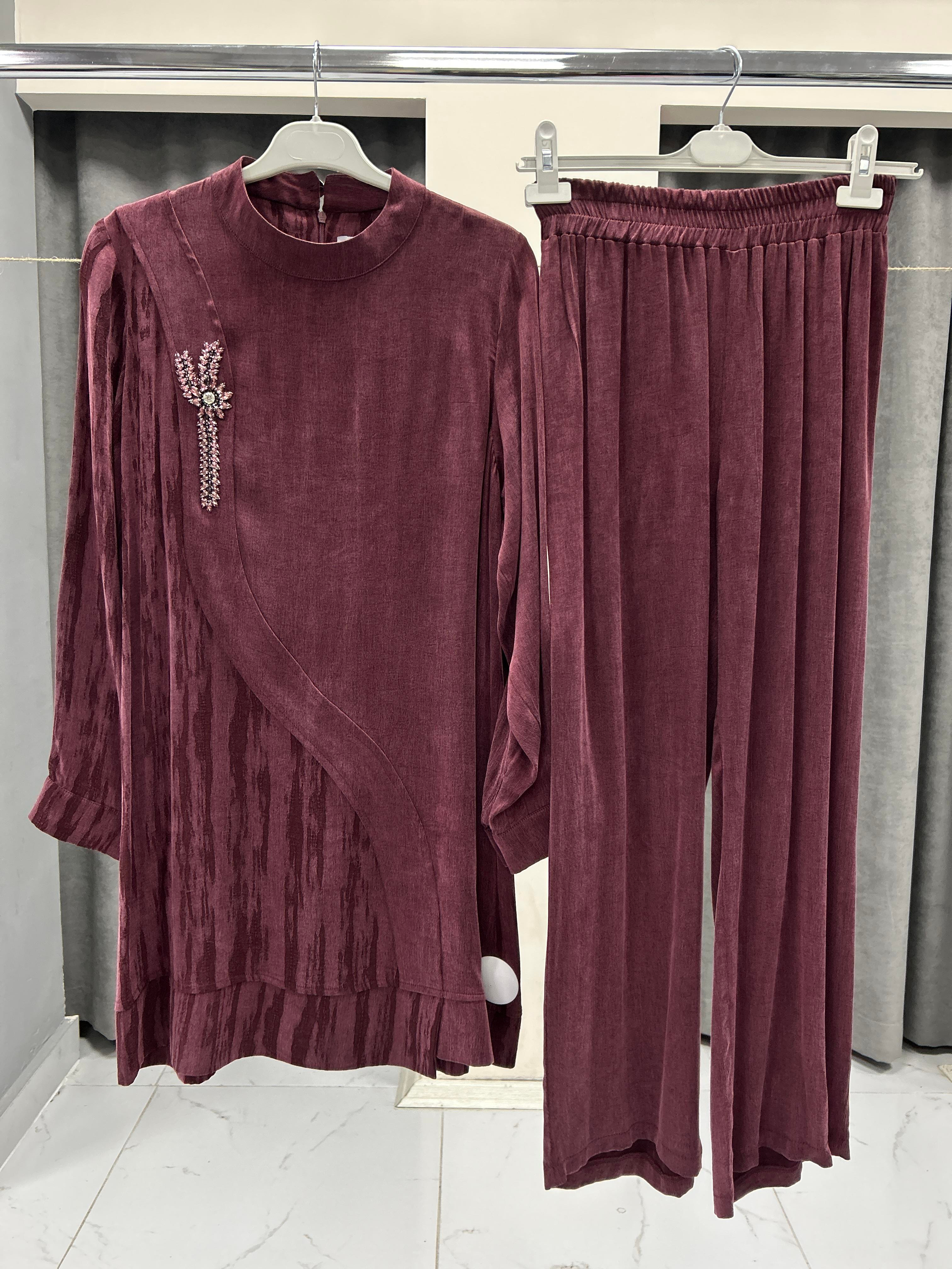 2428 ESVET TAŞ İŞLEMELİ İPEK CUPRA KUMAŞ İKİLİ TAKIM - BORDO
