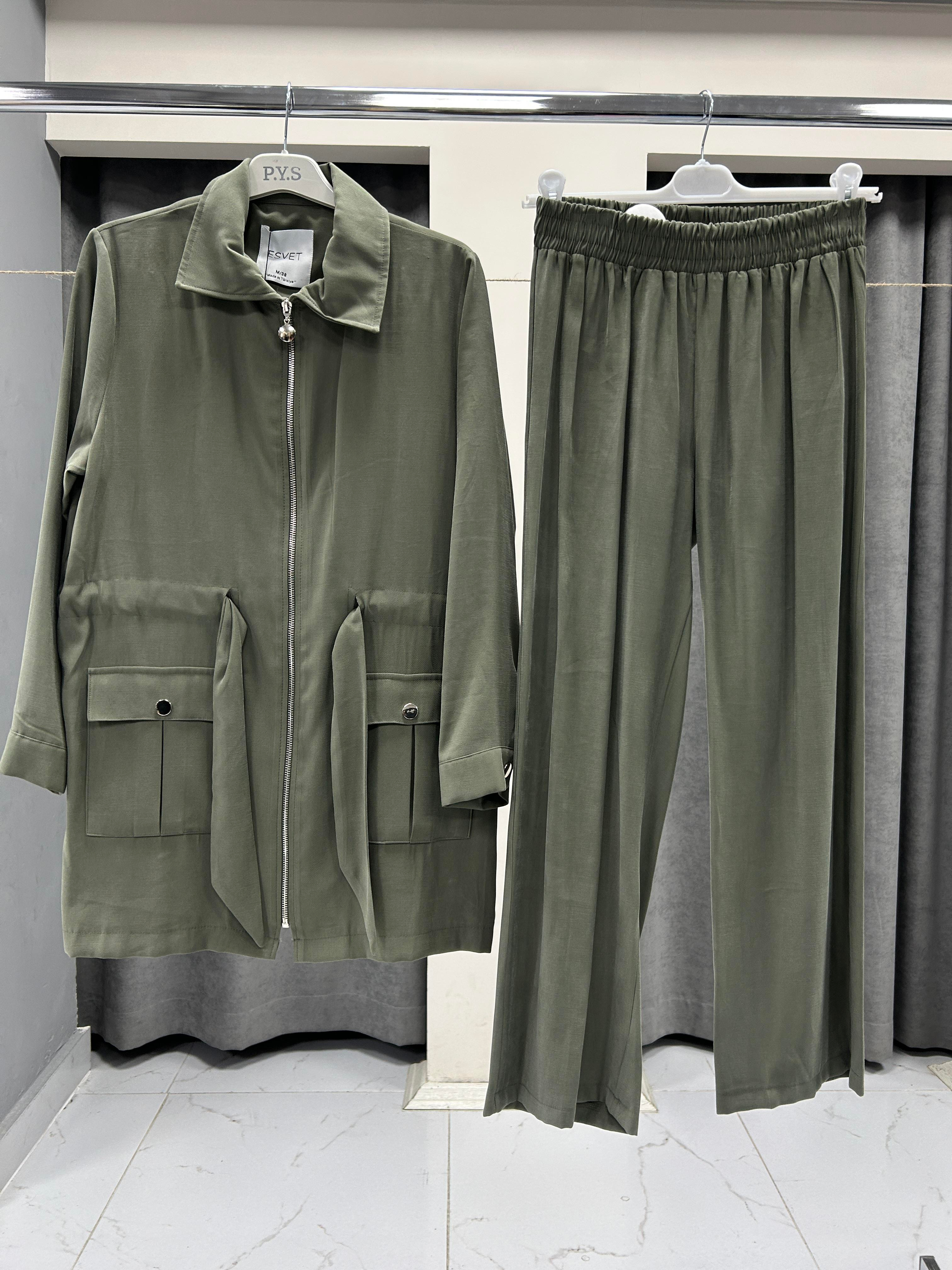 2472 ESVET BELDEN KUŞAK DETAYLI TENSEL KUMAŞ İKİLİ TAKIM - HAKİ