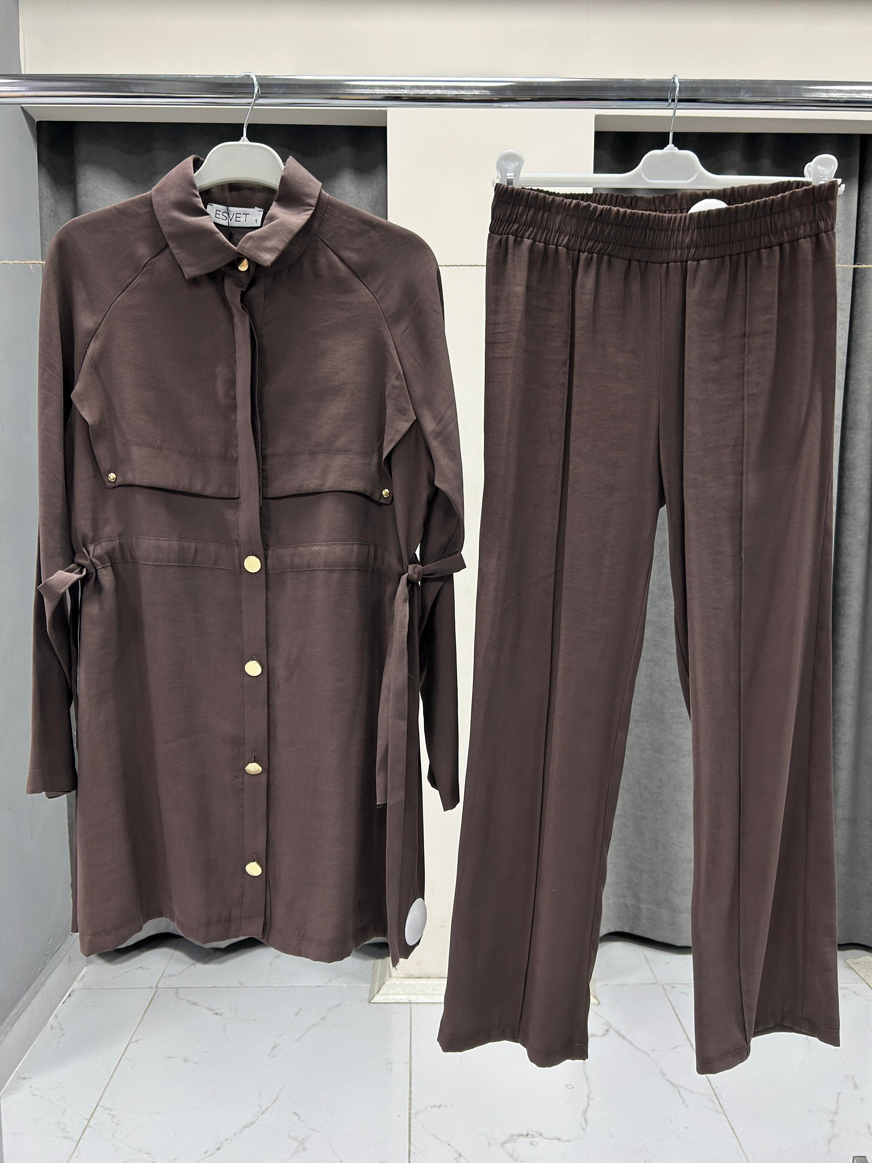 2560 ESVET YANDAN BAĞLAMA DETAYLI İKİLİ TAKIM - KAHVERENGİ