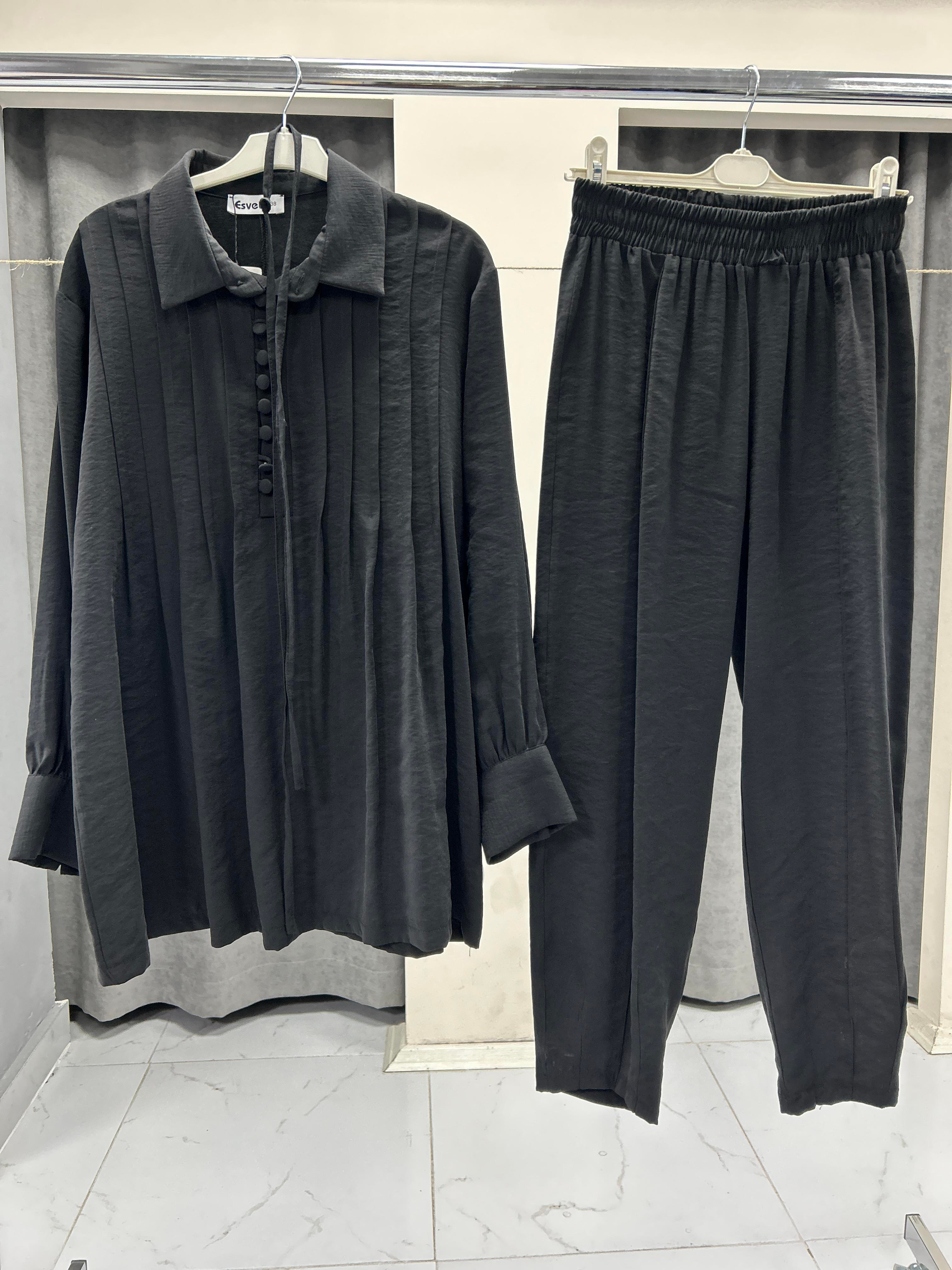 2570 ESVET ÖNDEN DÜĞME DETAYLI İKİLİ TAKIM - SİYAH