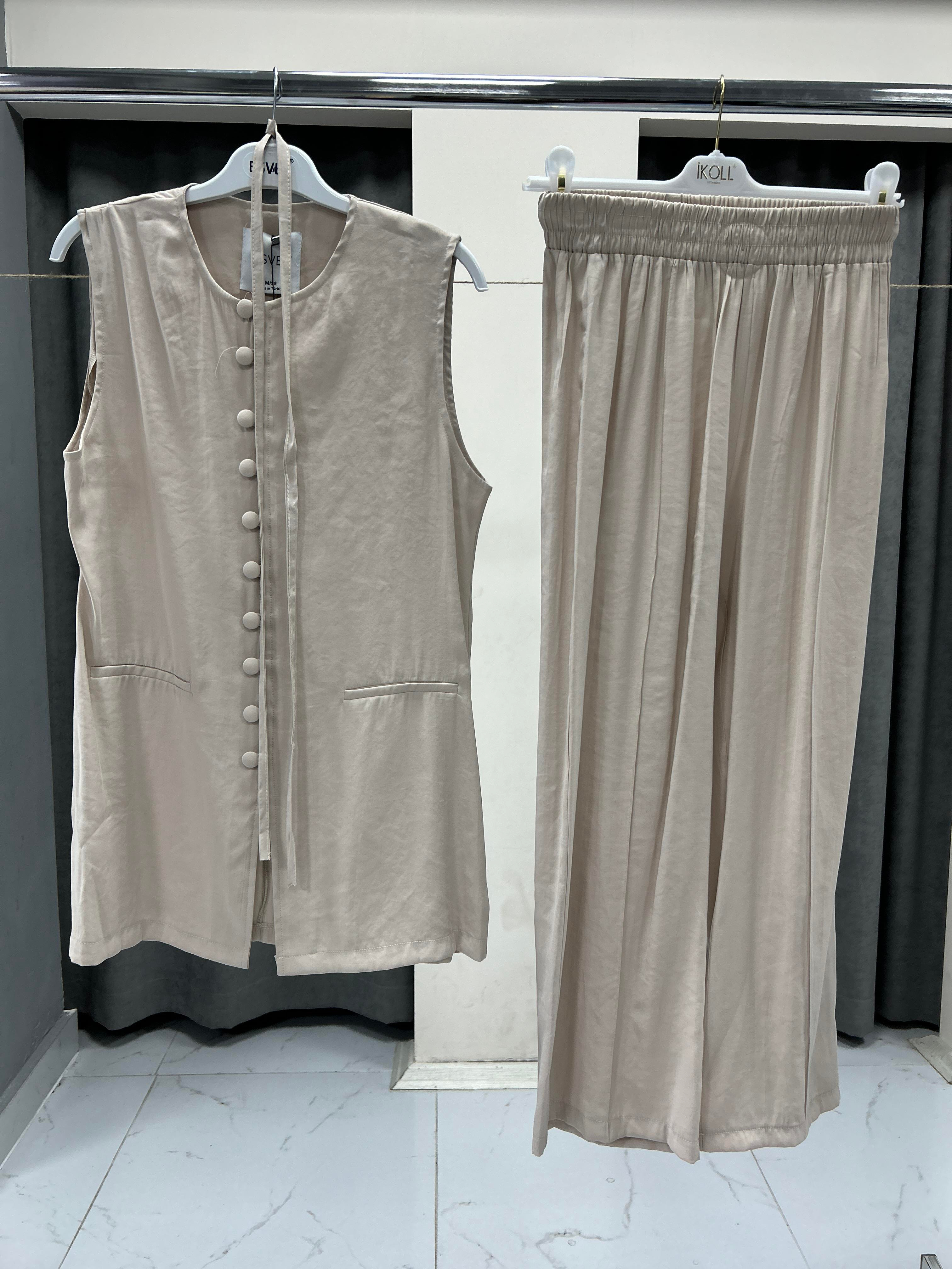 2599 ESVET DÜĞME DETAYLI YELEKLİ TAKIM - KREM