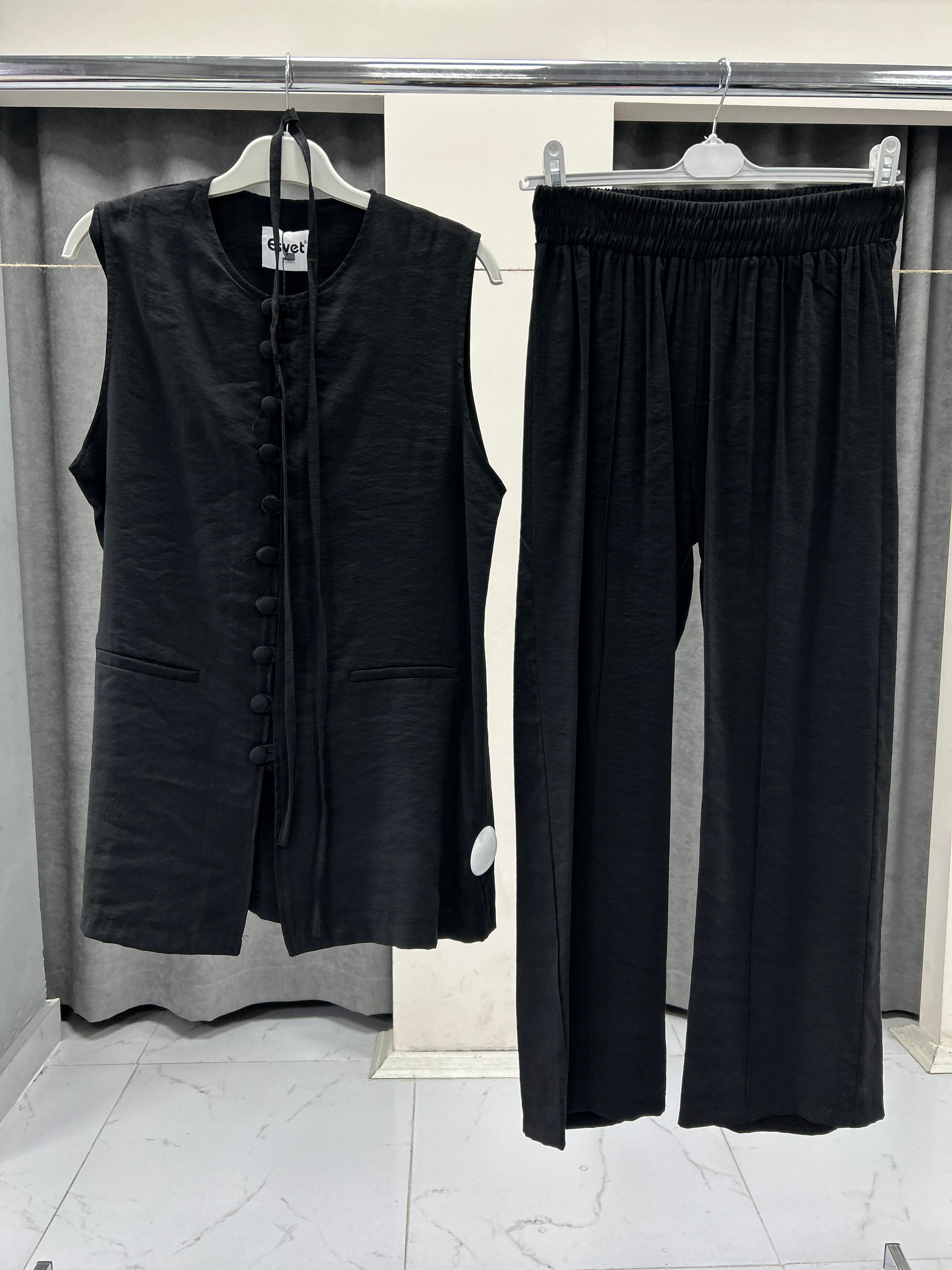 2599 ESVET DÜĞME DETAYLI YELEKLİ TAKIM - SİYAH