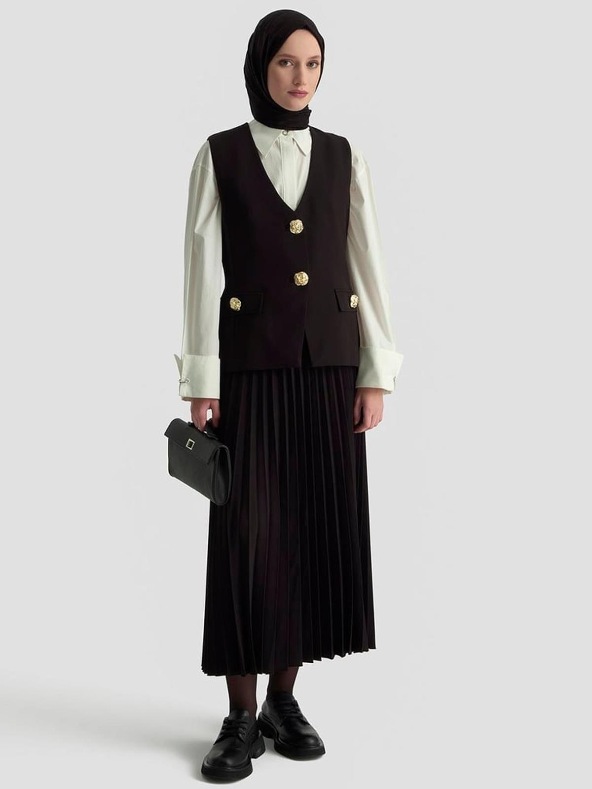 25KT643 ARMİNE TREND GOLD DÜĞMELİ CEP DETAYLI PİLİSE ETEKLI YELEKLI İKİLİ TAKIM - YAĞ YEŞİLİ