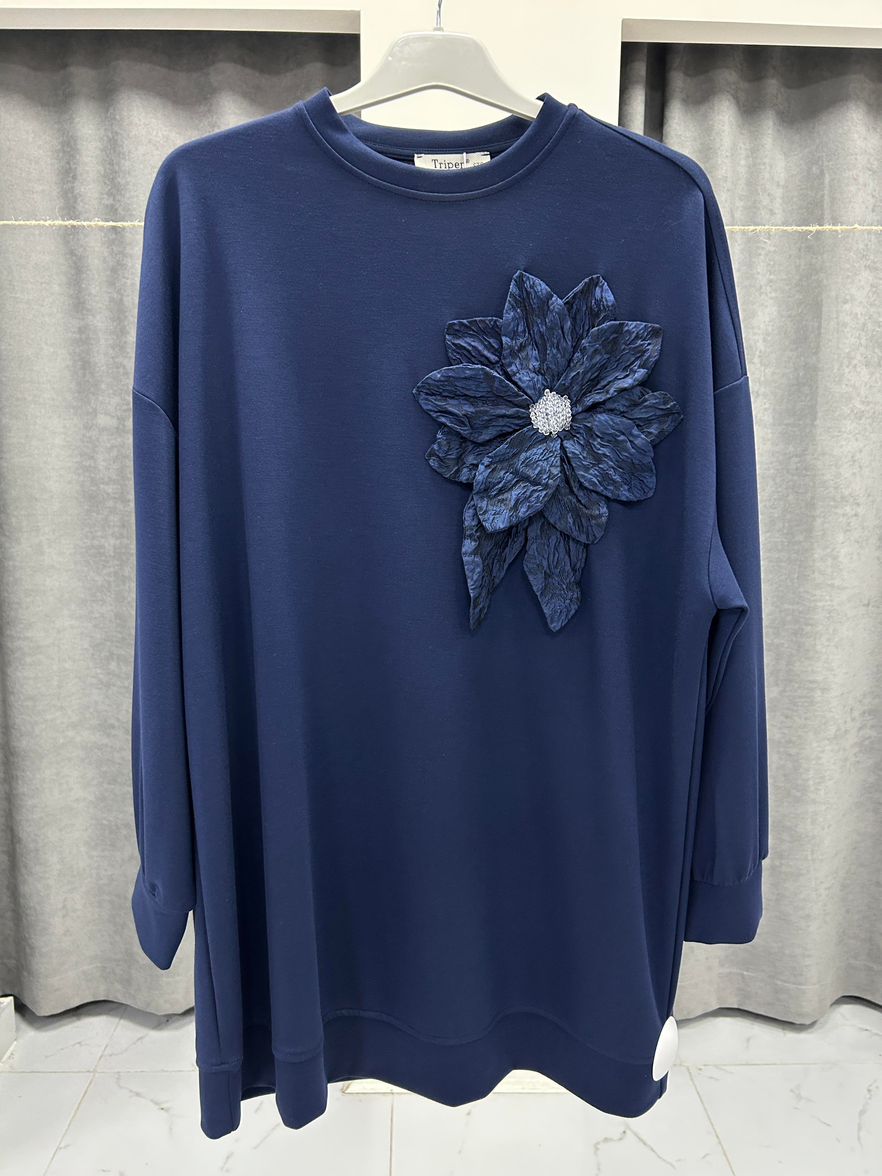 2977 TRİPEN ÇİÇEK DESENLİ TAŞ DETAYLI TUNİK - LACİVERT