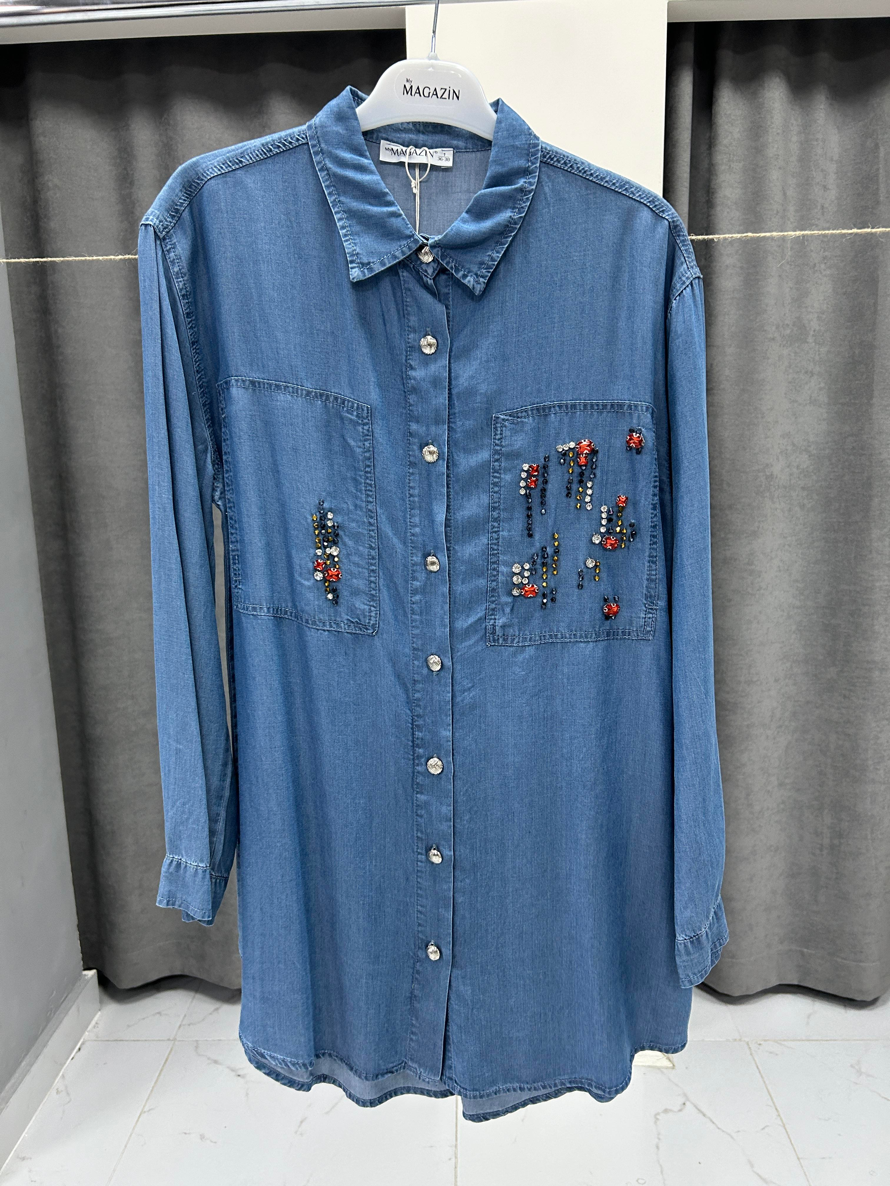 7118 MY MAGAZİN TENSEL KUMAŞ TAŞ İŞLEMELİ GÖMLEK - AÇIK MAVİ