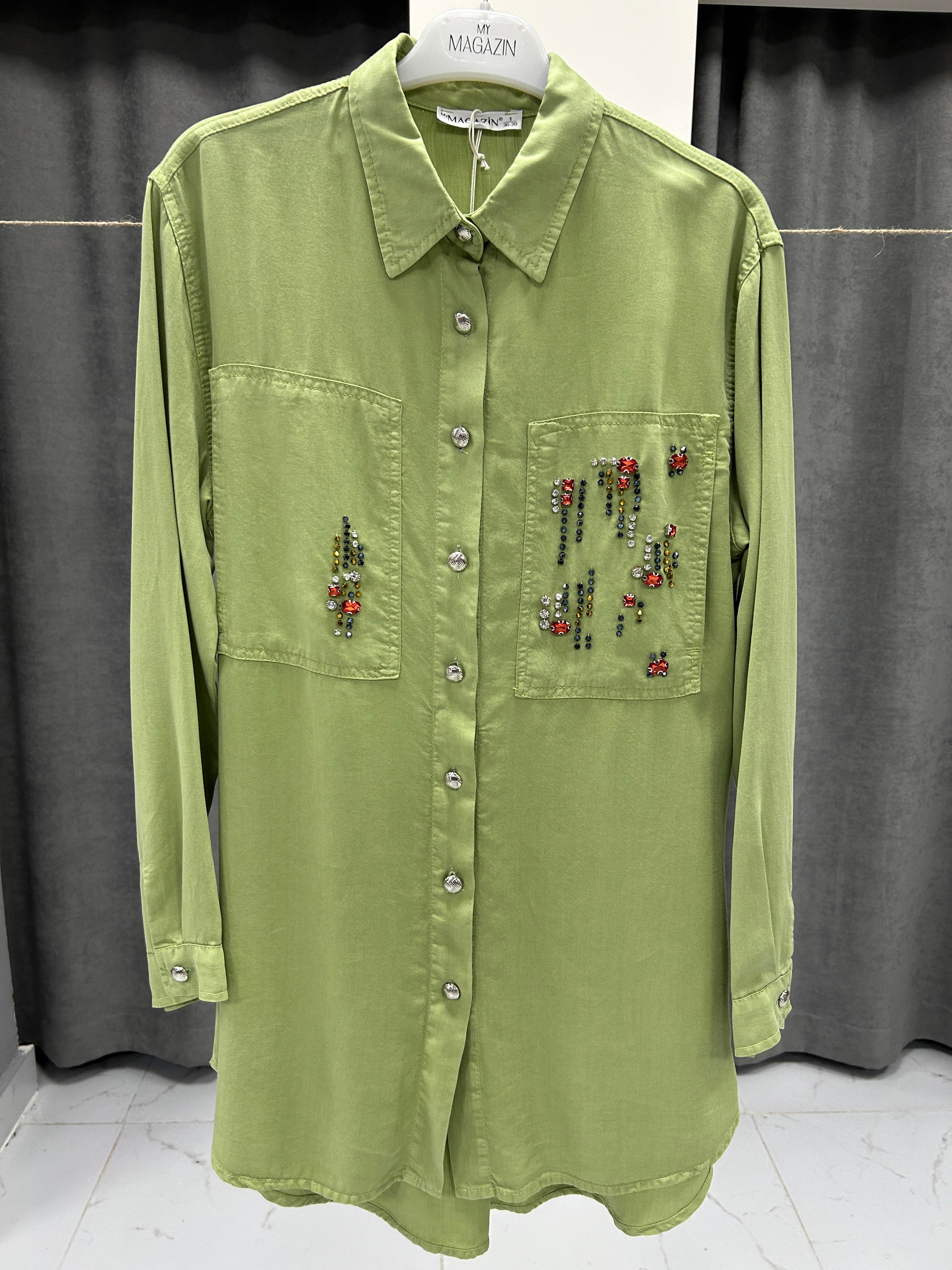 7118 MY MAGAZİN TENSEL KUMAŞ TAŞ İŞLEMELİ GÖMLEK - YEŞİL