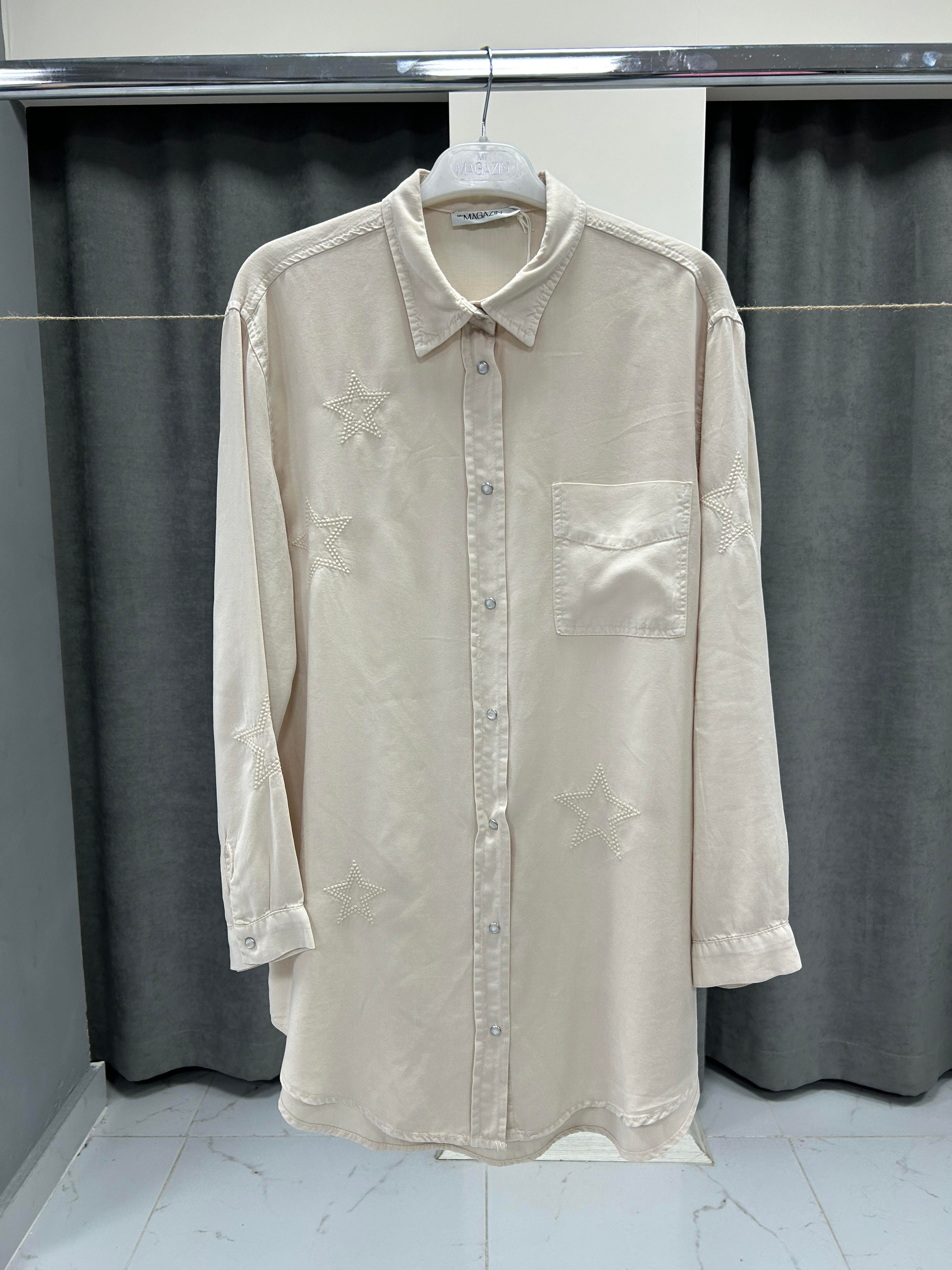 7127 MY MAGAZİN TENSEL KUMAŞ YILDIZ İŞLEMELİ GÖMLEK - EKRU
