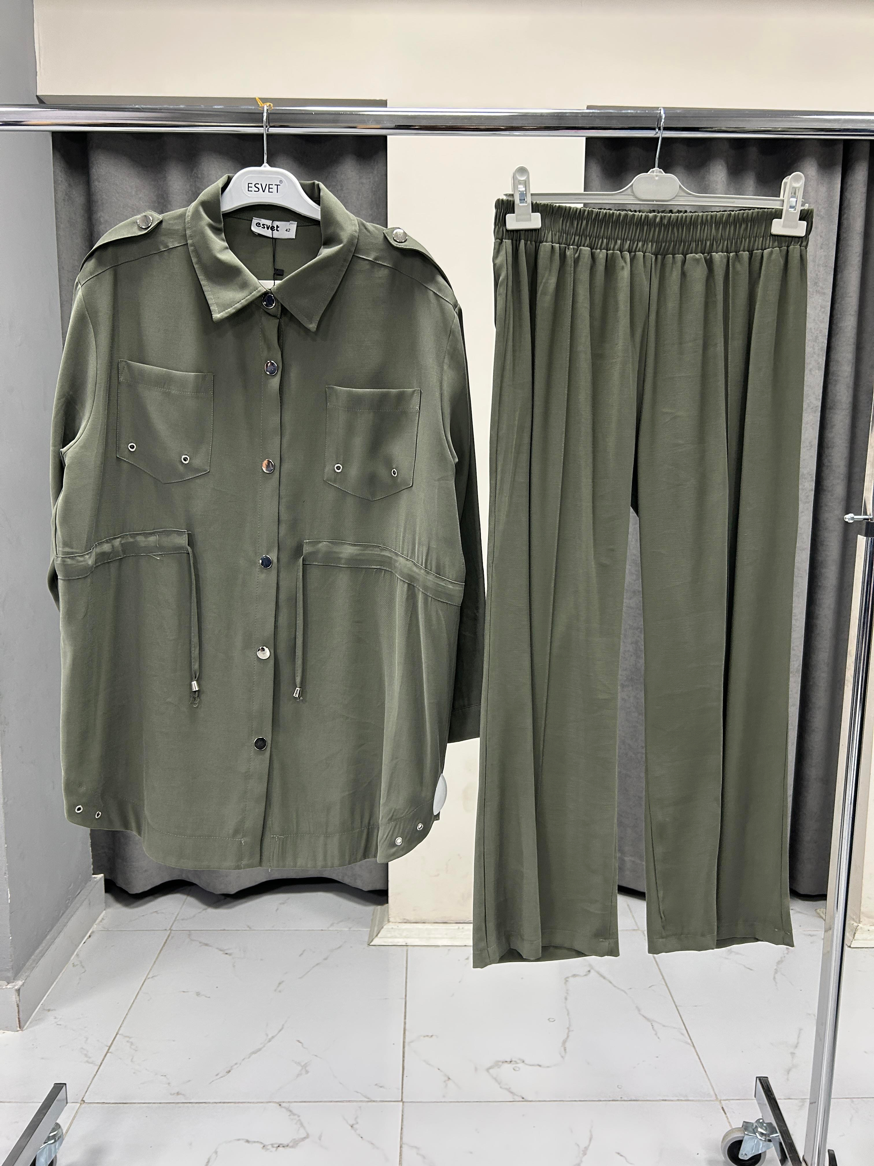 ESVET BELDEN BAĞLAMALI İP DETAYLI TENSEL KUMAŞ İKİLİ TAKIM - HAKİ