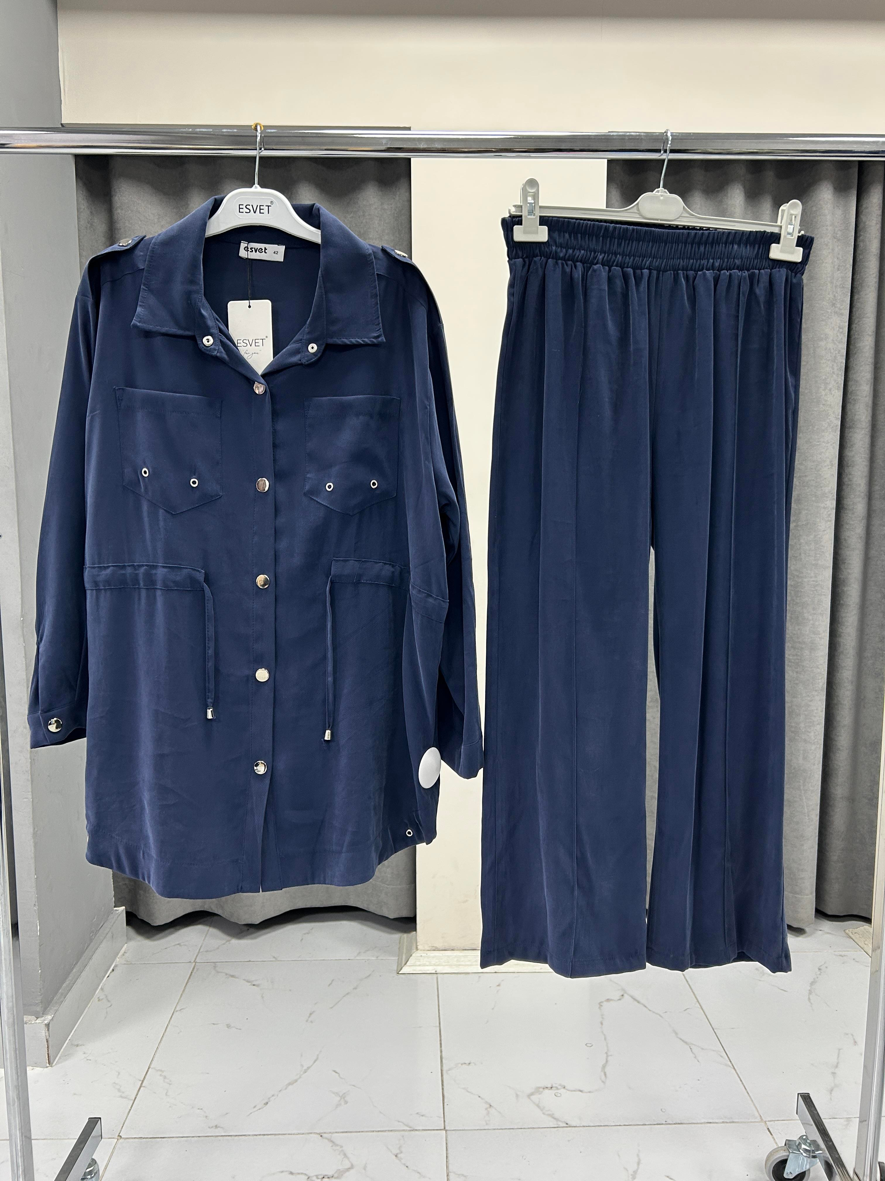 ESVET BELDEN BAĞLAMALI İP DETAYLI TENSEL KUMAŞ İKİLİ TAKIM LACİVERT
