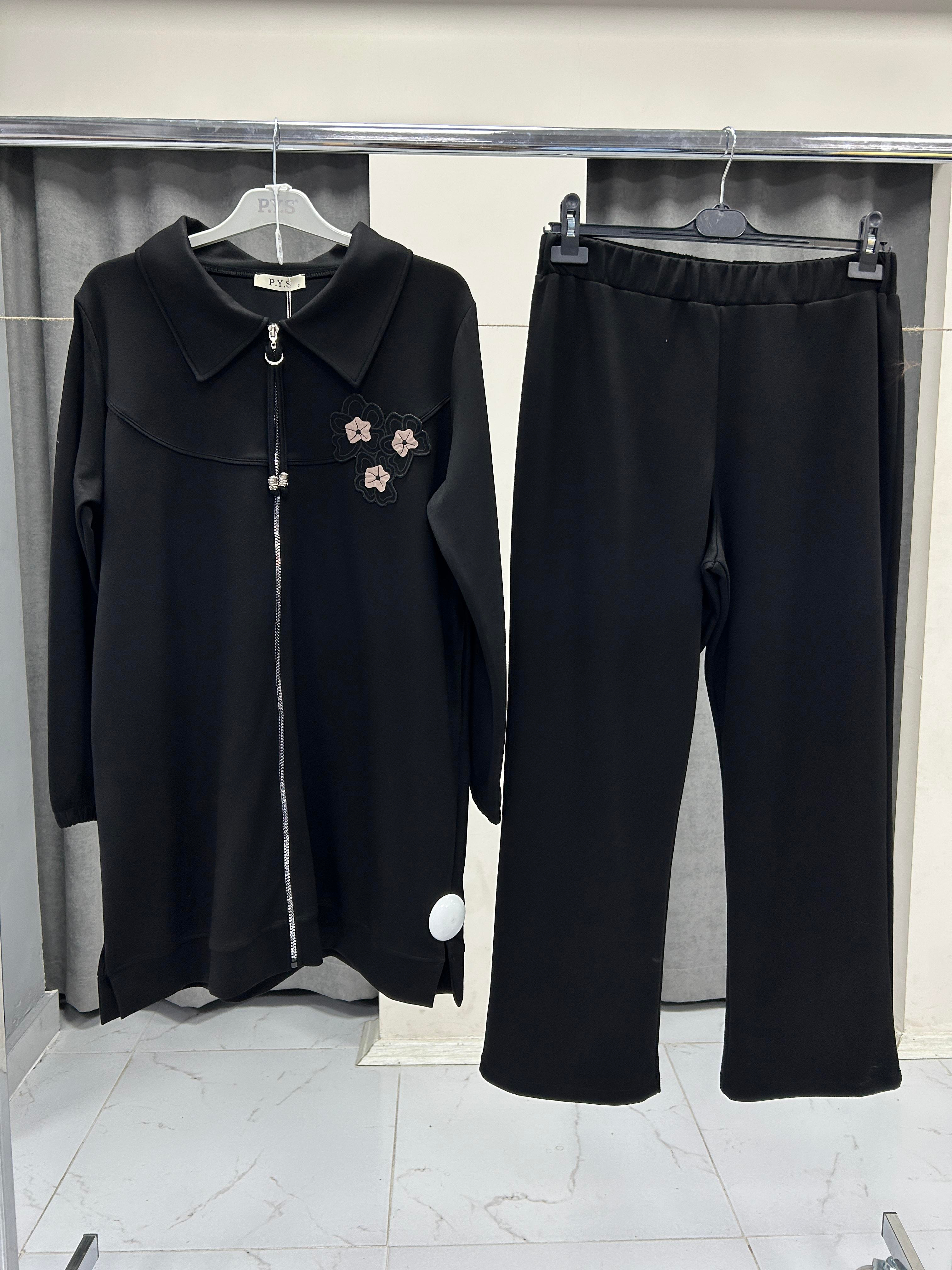 P25K20312-008 P.Y.S KADIN FERMUARLI ÇİÇEK DETAYLI TESETTÜR TAKIM - SİYAH