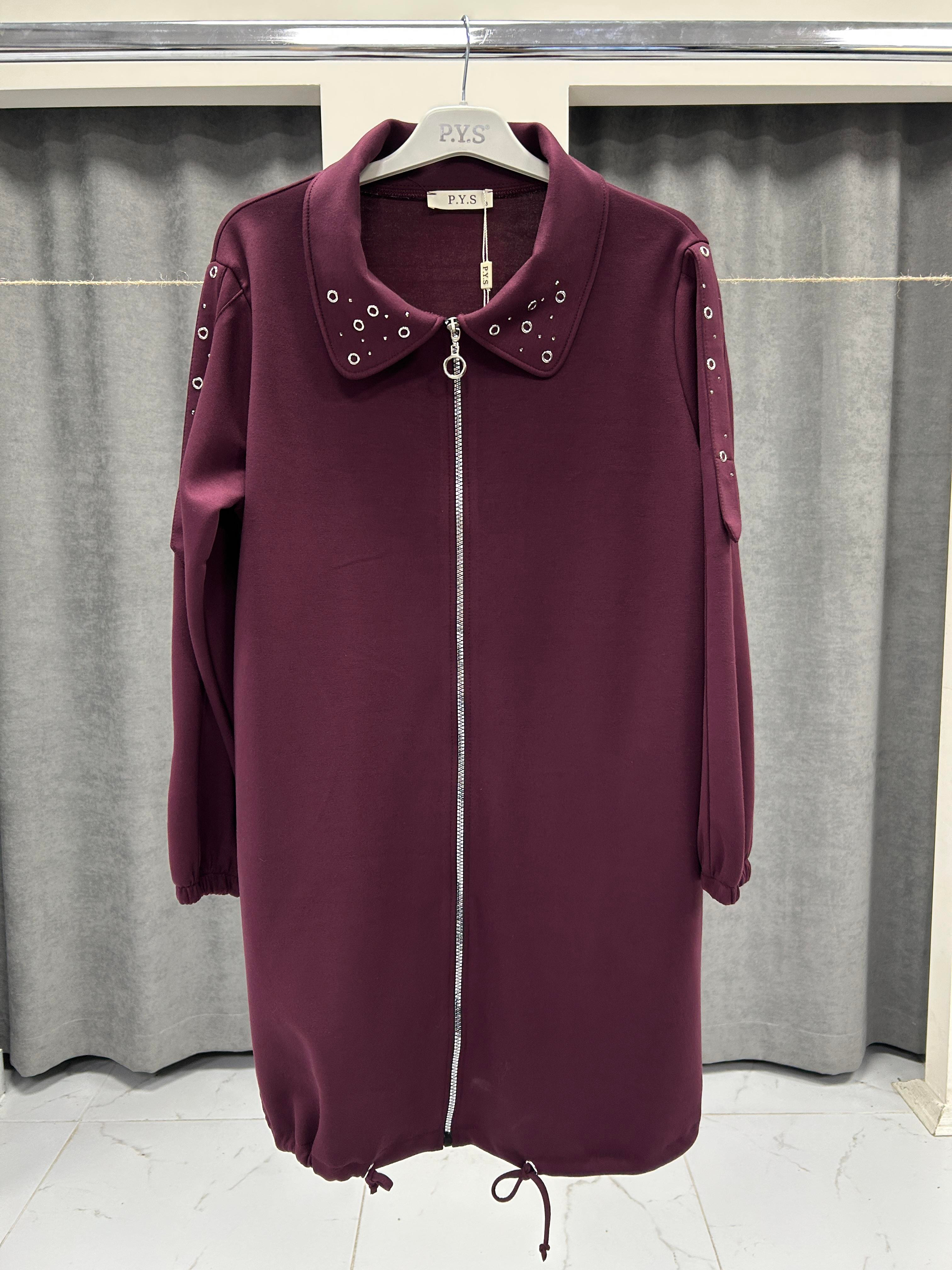 P25K40144-019 P.Y.S KADIN YAKA OMUZ TAŞ DETAYLI TESETTÜR KAP - BORDO